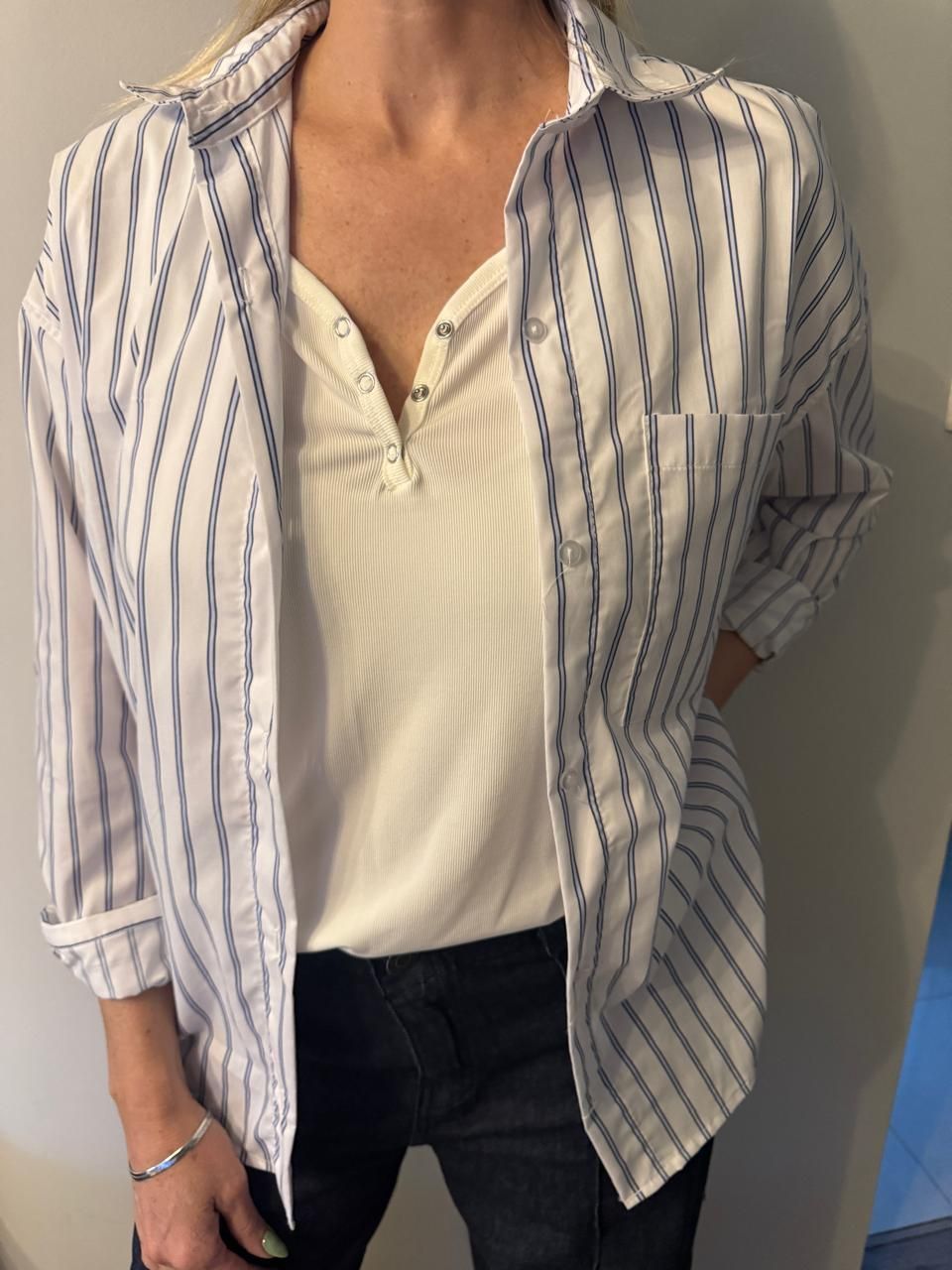 Camisa rayada con fondo blano y rayas azules disponible del talle 38 al 50