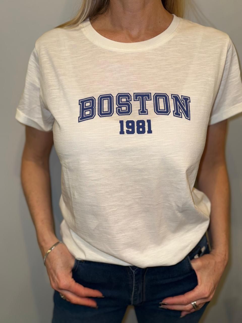 Remera algodon boston en blanco con letras azules disponible del 40 al 50